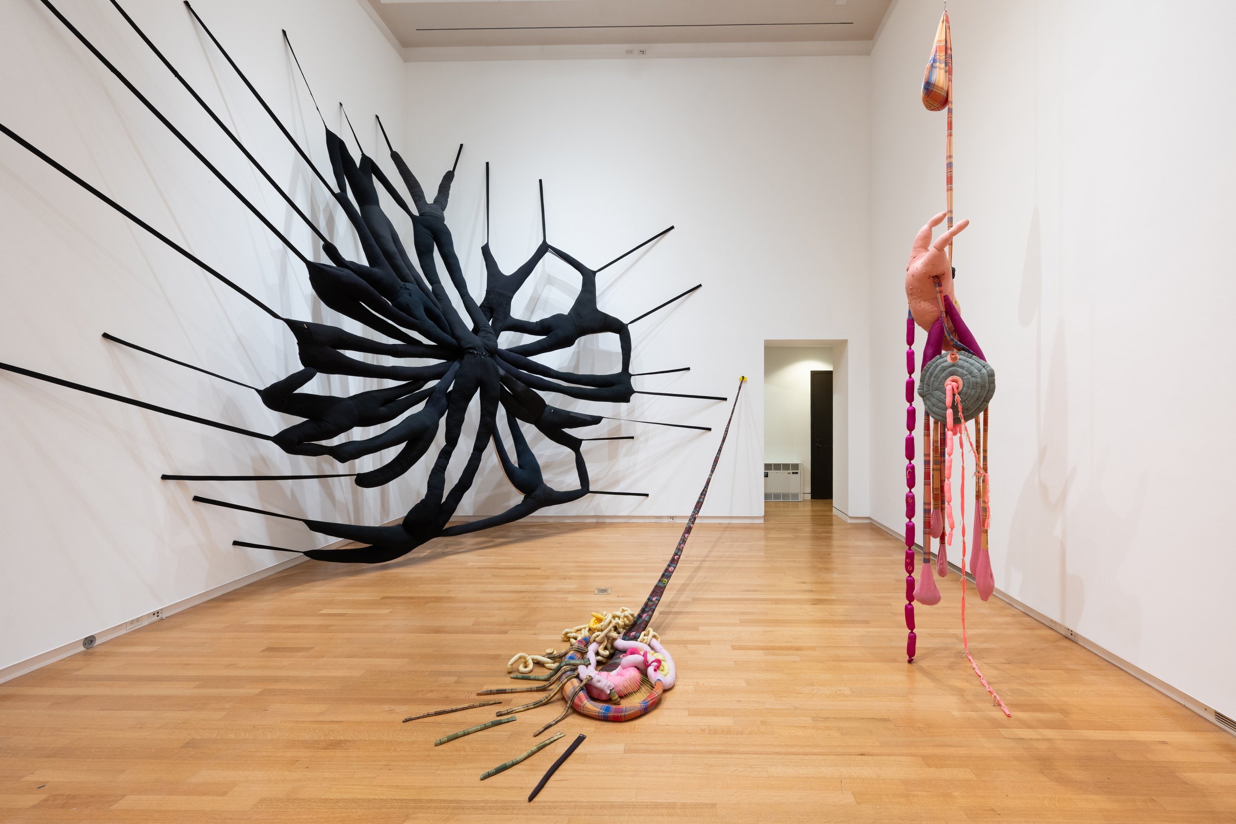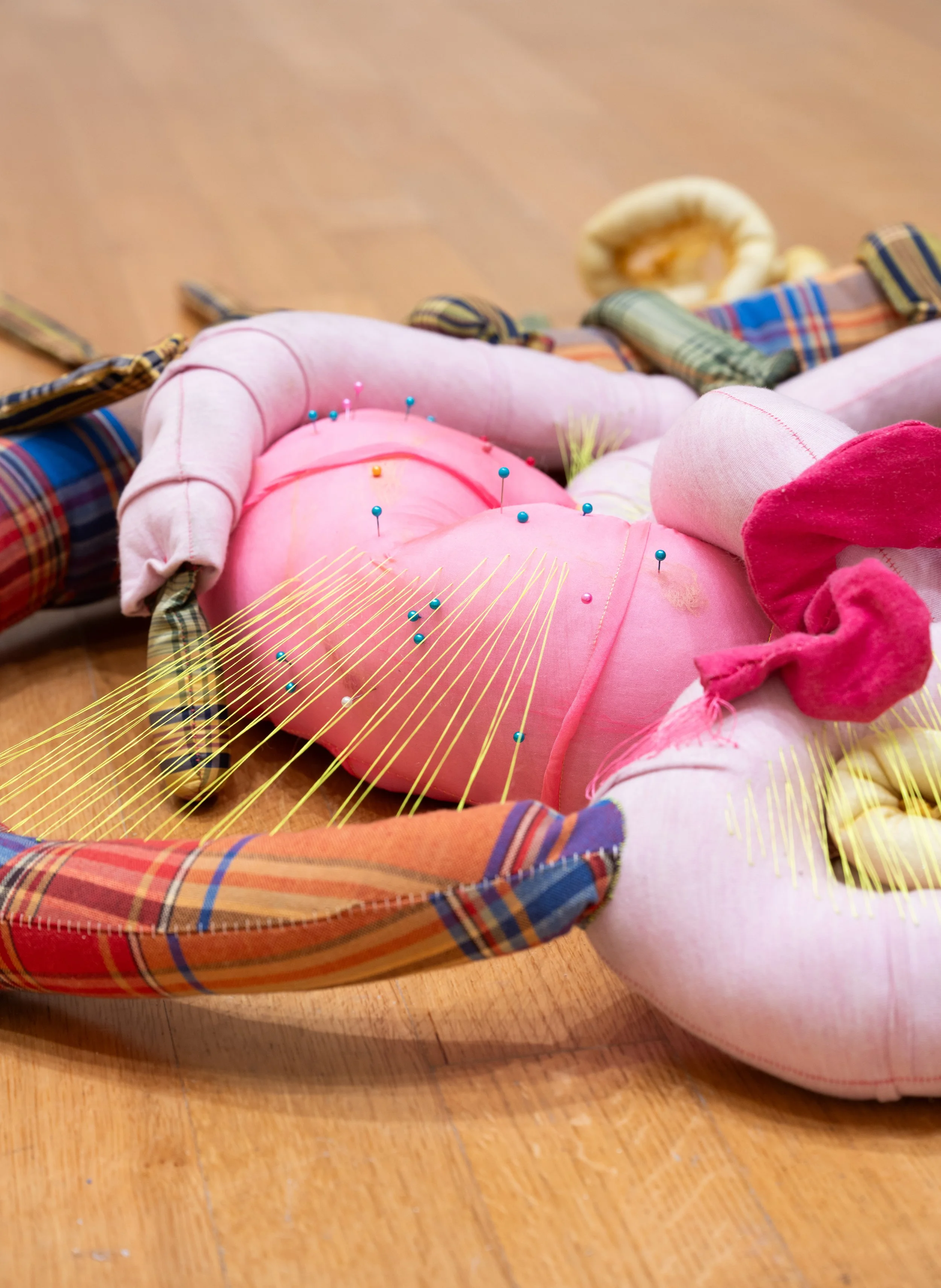 From a monumental spiderweb constructed with leggings, to plush guns that rattle, buzz, and shake, to tufted rugs and custom pillows, Soft Flesh and Volatile Insides upends expectations in Goucher College’s Silber Gallery. This group exhibition—including works by Monique Crabb, Charlotte Richardson-Deppe, Ash Garner, and Stephanie J. Williams—utilizes textile as a core material and its softness becomes a vehicle for tension, unease, and critique. Across the show, textiles are not employed decoratively or nostalgically, but instead operate as a means of probing the body and broader systems of labor, violence, and precarity.