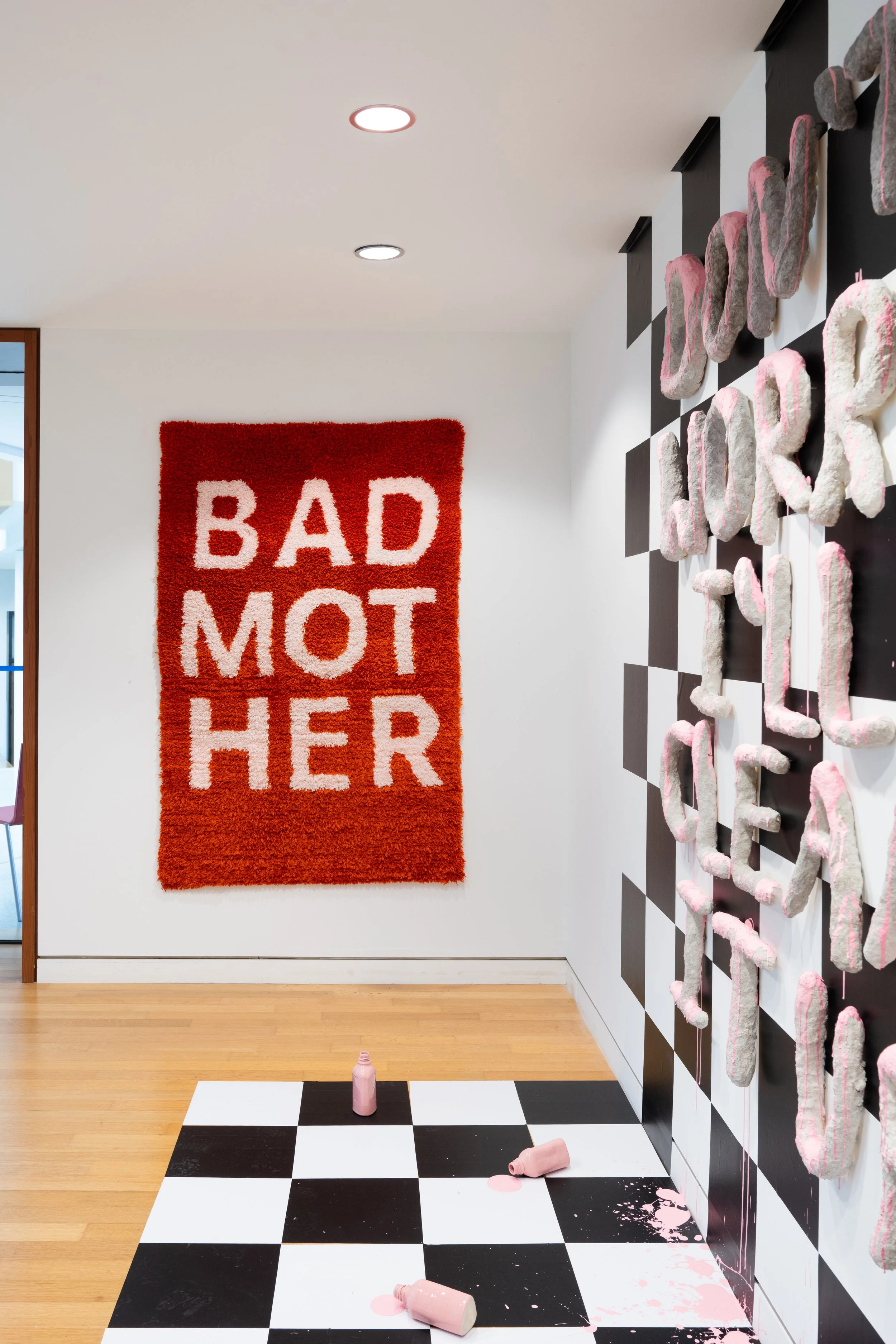 “Bad Mother” is a nearly 6ft by 4ft tufted red rectangle with the title text spelled out in soft pink. In three lines of text, with three characters in each line, the work disjoints a phrase that in another context would likely feel biting and harsh. While the piece feels like it could be a soft and simple decorative object, it cues the viewer into a much deeper inquiry by the artist. This work speaks to a contrastingly sharper, perhaps more painful, sense of self doubt or maybe as an externalized reaction to unjust criticism.