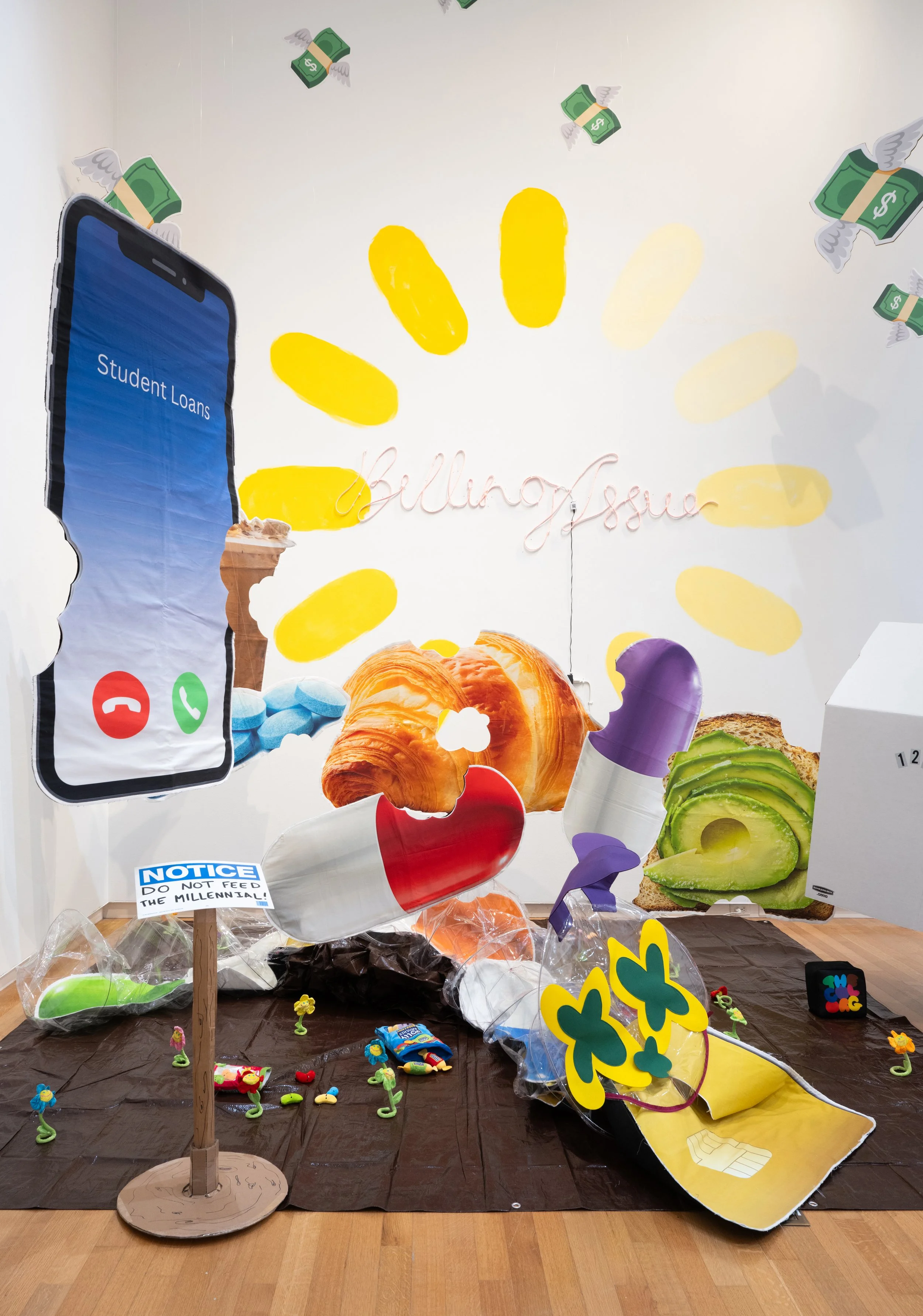 This scene calls to mind the frustrating and often endless feeling of interacting with billing sites whether those be student loans, rent payments, or even your local big-box retail store. The frustration and stress referenced in this installation is palpable, not only from the two elements previously described but also by the overall chaos and density of the full installation. There is little room to breathe when viewing Garner’s scene but seemingly countless things that need to be seen. A large iPhone displays a phone call from “Student Loans”, there are pills, croissants, and iced coffees with bites taken out of them, and a notice sign reading “DO NOT FEED THE MILLENNIAL.”