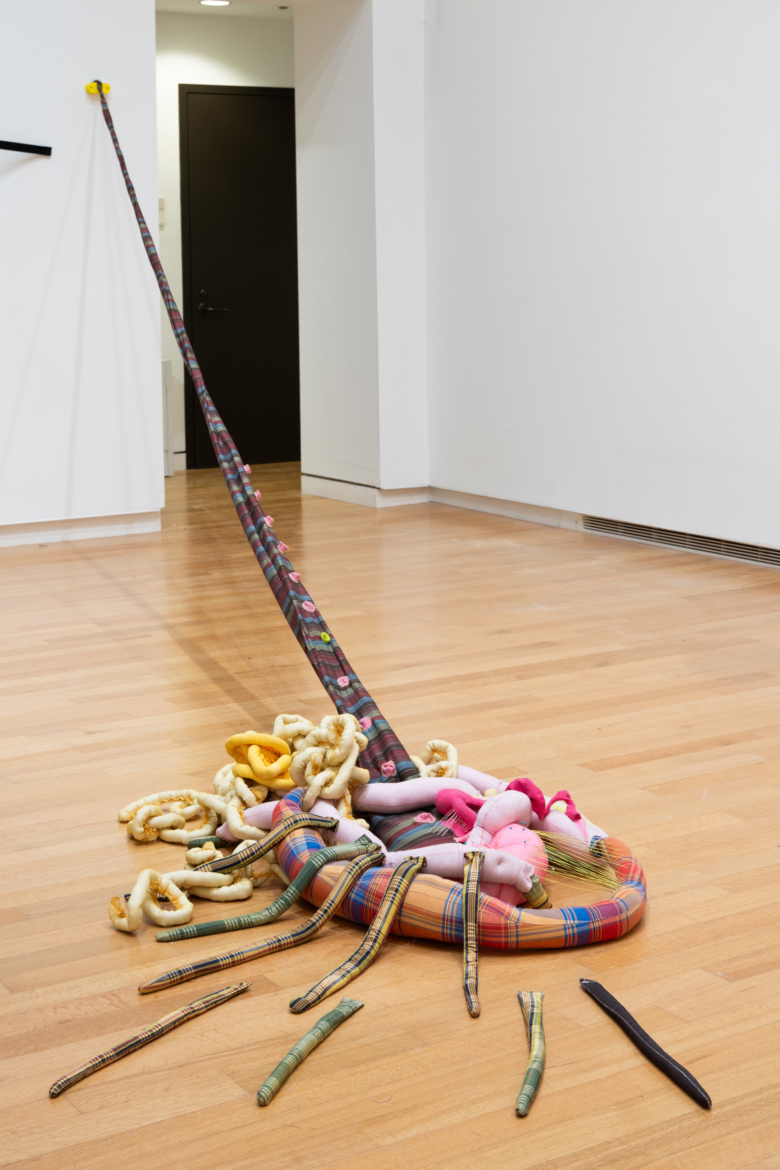 Williams also has one piece, “Missing the Good Stuff,” that lies heavily on the ground and is connected by a dozen or so feet of fabric to the wall farthest from the entrance to the gallery. This work is a busy and colorful pile of mostly intestinal forms with thin snake-like appendages that almost appear to be feeding on it. Some of the plaid, lamprey-like creatures are on their way towards the piece’s nucleus while others have already latched on. These linear elements are found on the opposing side of the piece to a long stretch of fabric which acts as a failing lifeline, a final connection to a body unable to fend off parasitic invaders.