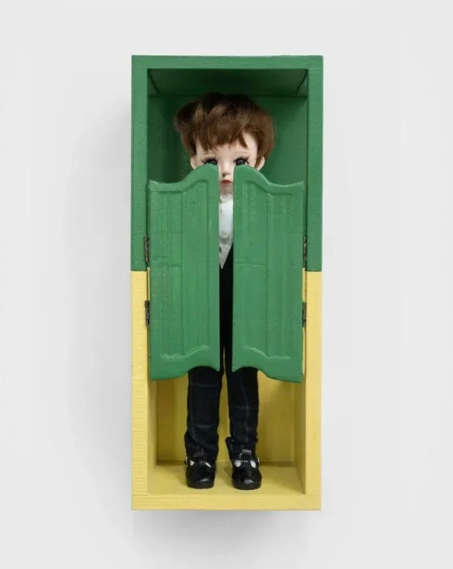 She prefers small-scale work and, at art hall, smallness becomes an asset. With no spectacle to coast on, you are compelled to crouch, lean in, pay attention. Her drawings too resist resolution, their minimalism amplifying emotional intensity: every smudge matters. And there is humor here – the low hum of the absurd, the awkward, the not-quite-right. Beneficiary, for instance, presents a male doll behind green and yellow saloon doors with a vintage Swarovski crystal booger hanging from his nose, his unearned wealth and oblivious ignorance unconcealable. This edge-play is in line with the weaponized campiness of Cindy Sherman’s film stills or Laurie Anderson’s deadpan voiceovers, intelligent but never smug. At the heart of “There’s a Girl in My Soup” is a sense that feeling is structural. In an often mindlessly frenetic environment, Sam Anderson asks us to linger on the ambiguous gesture, the opaque expression, the fragment that won’t resolve. What’s the real story here, and what part of it am I?