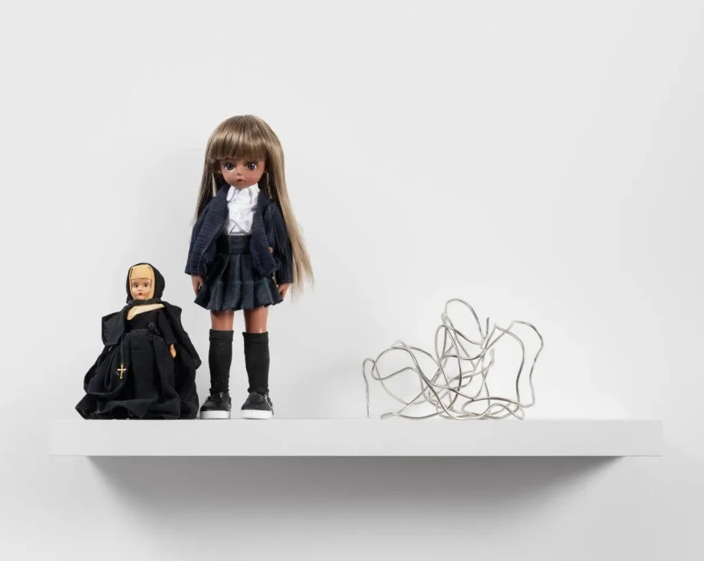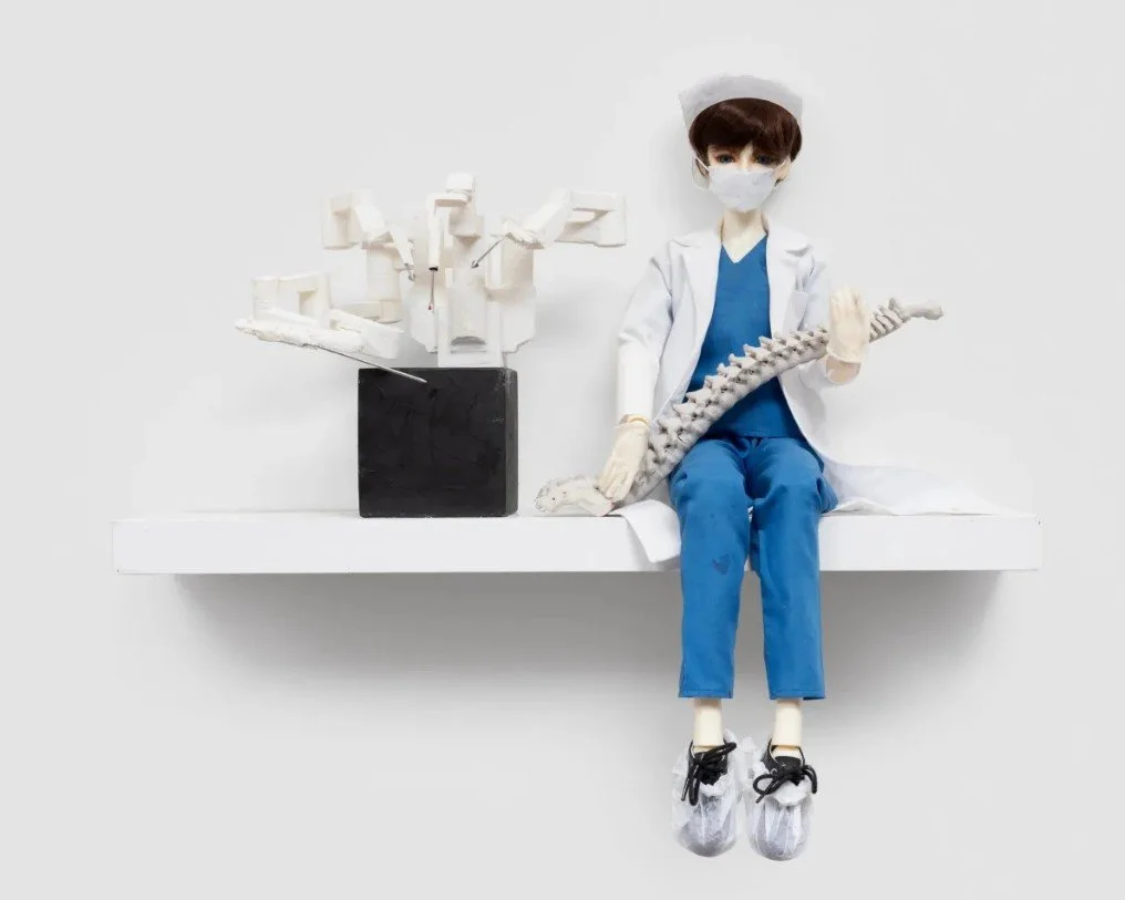The faces of Anderson’s figures are sometimes blurred or barely formed, as in Real Estate, in which a pair of female figures enjoy a glass of an unidentifiable liquid on a porch – a small drama to provoke thought. Her mother was a stage actress, and she is prone to imparting quietly theatrical structure to her work. Some of her figures are dolls as such, but that doesn’t make them any less affecting and in fact may make them more so by prompting viewers to look harder, à la Brecht. Mary & Mom & Hell’s Angels comprises a Bratz doll in a Catholic schoolgirl’s uniform, a vintage nun doll wearing a habit, and a gnarled mass of metal. In this trinity, the females are intact but threatened by a misogynistic current – the motorcycle club historically having barred women from being “full-patch” members. Surgeon’s very eclecticism – a nondescript doll, a scan of a spine, and a “cartooned” medical machine – underlines the artist’s rejection of any normative ranking of aesthetic components.