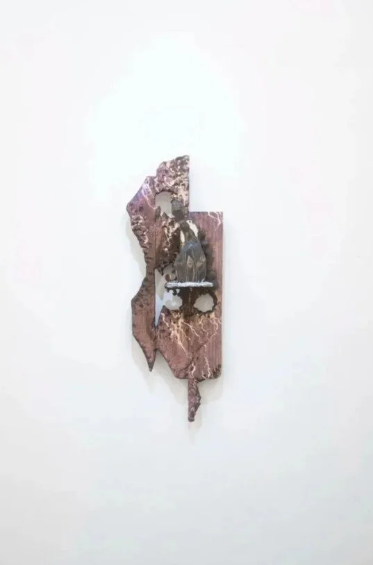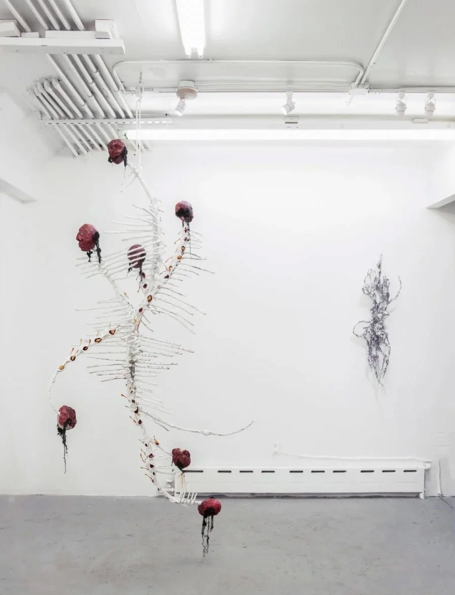 Yao’s large Axis anchors the front of the space with a form that feels like a collection of spinal cords, accentuated by seven shrunken heads complete with hair and teeth. Yao describes the work as three human spines intertwined and characterizes the spine as an “evolutionary failure” – a disastrously flawed and compromised product of evolution per the book Spinal Catastrophism, which contextualizes the sculpture’s sense of anatomical instability. The piece is part anatomy lesson, part ritual object, part crash debris. The red cavities and leech-like openings don’t diagram bodily order but rather speculate on how it came about.