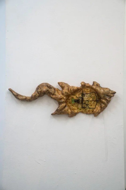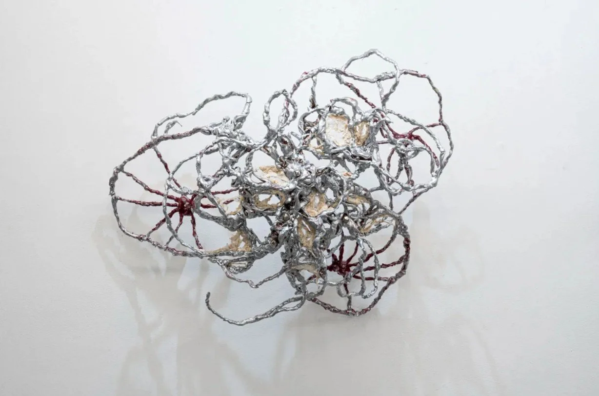 The feeling of transformation carries through Yao’s Anatomy works, which hang or spread across the walls like gesture drawings of a body that doesn’t understand its own borders. Anatomy #1 and Anatomy #2 push and pull between softness and armature. Both seem like growing entities, but Anatomy #1 comes across as metallic and almost mechanical, Anatomy #2 as live and lumpy, its transparent gooey sections and yellow pulpy material suggesting discarded medical waste or half-developed organic matter. These works are like wounds and webs within failed prostheses.