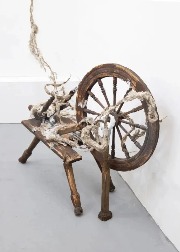 Echo Yan, The Spinner, 2025, raw wool, antique spinning wheel, pine, resin, epoxy clay, dimensions variable
